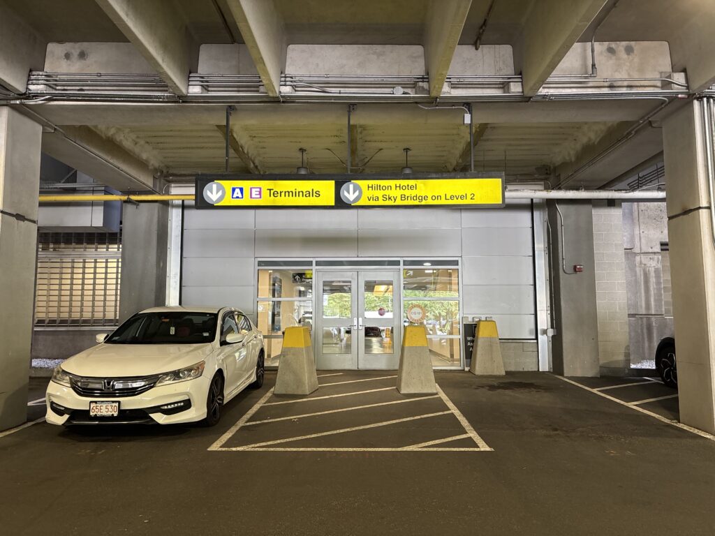 Tip: There’s another elevator/stairwell across the rideshare pickup lane, but following signs for the Hilton will take you to the correct one.